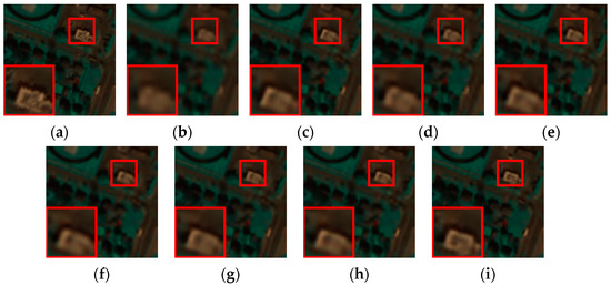The HSI SR results on the Houston dataset (scale factor 4). (a) Ground truth; (b) bicubic; (c) VDSR; (d) 3DFCNN; (e) EDSR; (f) GRDN; (g) HLNnet; (h) Interactformer; (i) ours. The false color image is used for clear visualization (red: 15, green: 30, and blue: 45). The red boxes are used to mark the original and upsampled area.