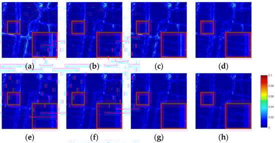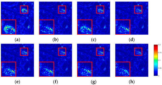 Error images between the reconstructed images and the reference images in the Chikusei dataset (scale factor 4). (a) bicubic; (b) VDSR; (c) 3DFCNN; (d) EDSR; (e) GRDN; (f) HLNnet; (g) Interactformer; (h) ours. The red boxes are used to mark the original and upsampled area.