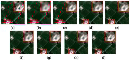 The HSI SR results on the Chikusei dataset (scale factor 4). (a) Ground truth; (b) bicubic; (c) VDSR; (d) 3DFCNN; (e) EDSR; (f) GRDN; (g) HLNnet; (h) Interactformer; (i) ours. The false color image is used for clear visualization (red: 55, green: 85, and blue: 30). The red boxes are used to mark the original and upsampled area.