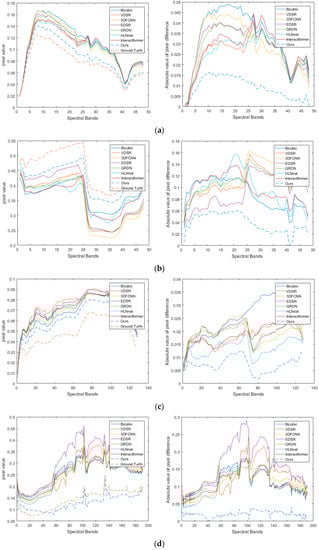 Spectral curves and difference curves on a selected pixel value of the three datasets with the scale factor of 4. (a) Houston; (b) HSRS-SC; (c) Chikusei; (d) Washington DC Mall.