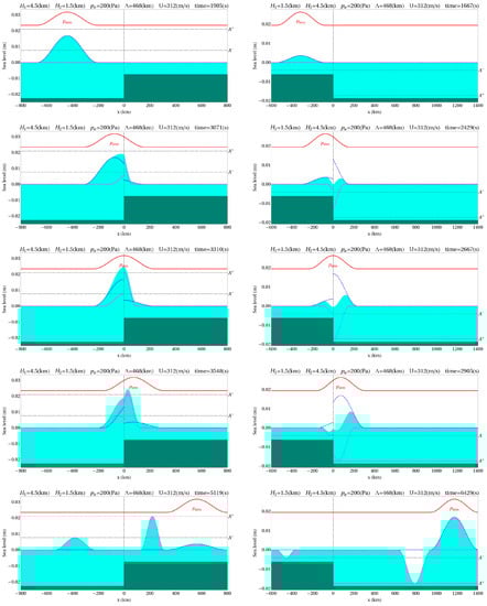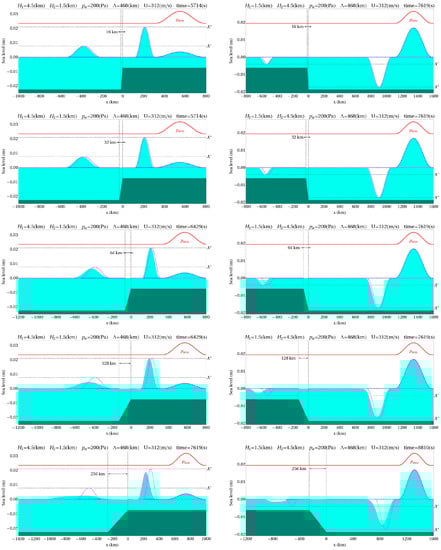 In actuality, variation of the ocean depth is not jump-like, but quite smooth. The maximum average bottom slopes reached, for instance on the continental slope, amount to 0.1. Data available in the GEBCO numerical atlas indicate that local bottom slopes are, as a rule, limited by the value of 0.3 [47]. The numerical model permits one to analyze how the submarine slope steepness influences the parameters of arising free waves. In Figure 2, examples are shown of free wave calculations for various slopes of the bottom. The minimum depth in the examples presented was , while the maximum amounted to . The length of the plane slope varied between 4 and , which corresponded to the range of bottom slopes from 0.00586 up to 0.75. As in Figure 1, the blue and purple dotted curves show the theoretical wave shapes, which correspond to jump-like depth variation. From Figure 2, it can be seen that the parameters of free waves arising on a gentle slope and at a jump in depth may differ significantly. A free wave propagating in a direction opposite to the propagation of atmospheric perturbation is subject to the largest variations: enhancement of the slope length reduces the amplitude of this wave and increases its length. A free wave propagating in the same direction as the atmospheric perturbation behaves in a totally different manner. Enhancement of the slope length starts to noticeably reduce the amplitude of this free wave only in the case of slope lengths exceeding .