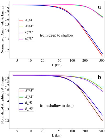 From Figure 3, it can be seen that the amplitude and energy of waves propagating in the same direction as the Lamb wave remain close to the values corresponding to jump-like variation of depths, straight up to slope lengths of . In the case of waves propagating in the opposite direction, amplitude and energy reduction starts noticeably earlier, already at . In other words, if a submarine slope is shorter than , then for estimation of the amplitude and energy of free gravity waves it can be dealt with a jump-like change of depth. It is remarkable that the normalized curves for the “from deep to shallow” case and for the “from shallow to deep” case do not differ much from each other.