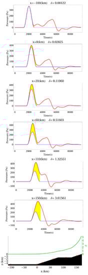 The results of numerical calculations are shown in Figure 4. The red curve shows the course of bottom pressure over time, calculated for six virtual PGs. The blue curve represents the forced wave calculated by Formula (8), taking into account the depth of the PG location. The yellow fill shows the difference between the red and blue curves during the passage of the Lamb wave. The following dimensionless parameter was calculated as a quantitative measure of the difference between the curves: