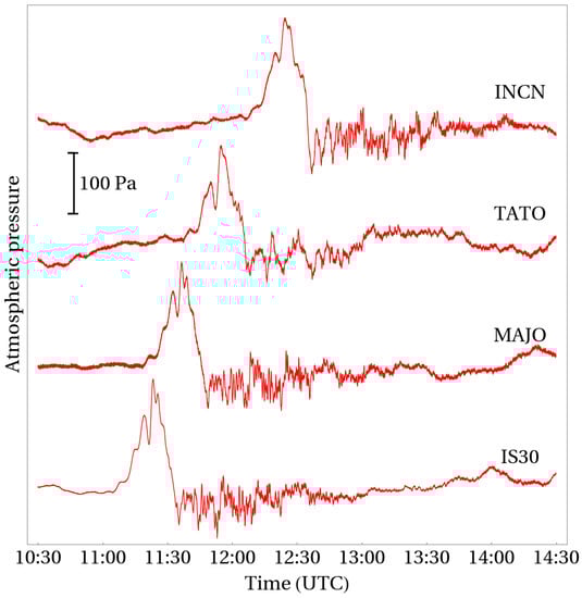 In the above-mentioned region, the atmospheric Lamb wave, caused by the explosive eruption, was recorded by four land-based barographs, three of which (MAJO, TATO, INCN) belong to the IRIS network (http://ds.iris.edu/ds/ (accessed on 25 January 2022)) and are characterized by a data sampling rate of . The fourth barograph of IS30 refers to The International Monitoring System Infrasound Network/CTBTO; data sampling rate is . The location of the barographs is shown in Figure 5 with red squares.