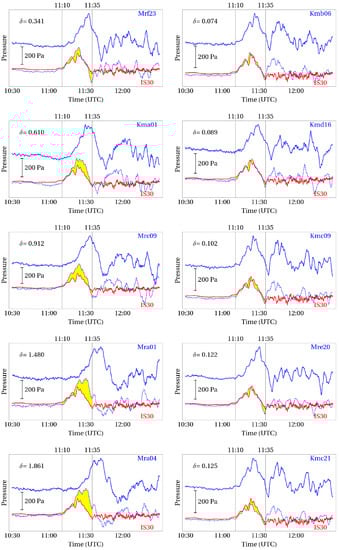 Variations of pressure, registered by PG/DONET (blue solid line) at the ocean bottom and by the barograph IS30 in the atmosphere (red solid line). The blue dotted line shows variations of the bottom pressure multiplied by the correcting coefficient and shifted in time by , where is the difference in distance (geo-distance) from the Hunga Tonga–Hunga Ha’apai volcano to the barograph IS30 and from the Hunga Tonga–Hunga Ha’apai volcano to the DONET station. The yellow fill shows the difference between the red and blue dotted lines during passage of the positive phase of the Lamb wave. The values of parameter are indicated in each of the fragments of the figure.