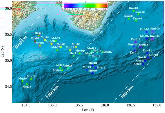Bottom relief in the area of the location of the deep-sea observatories DONET (colored diamonds). The color of the diamond corresponds to the value of the quantity, , that characterizes the difference between the observed signal and the theoretically calculated forced perturbation. The color scale is shown at the top of the picture. The white dotted lines showing the distance from the Hunga Tonga–Hunga Ha’apai volcano are constructed at intervals of .