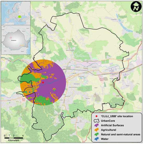 Cluj-Napoca is a city of approx. 400,000 inhabitants located in the North-West part of Romania, in the Someș river valley, surrounded by hills. The measurement site is located at the Faculty of Environmental Science and Engineering (Lat.: 46.76833°N, Long.: 23.55139°E, elevation: 405 m). The measurement station is part of ACTRIS (Aerosols, Clouds and Trace gases Research Infrastructure, https://www.actris.eu/, accessed on 15 April 2023) network and has conducted aerosol measurements since 2010. The Cluj-Napoca AERONET measurement station can be considered representative for the whole Transylvanian territory, and also for the Pannonian Basin, given the limited coverage in Hungary, Austria, and South-Western Ukraine [39]. The main sources of local emissions are represented by heavy traffic and heating facilities during winter, with few emissions related to industrial facilities [40,41]. The positioning of the city in a valley with neighboring high topography may cause frequent temperature inversions during the winter season [42], and contributes to the accumulation of air pollution in the city [41]. In addition, long-range transported aerosols such as Saharan dust [39] and biomass burning [43] may also influence the area. A detailed view of Cluj-Napoca and the surrounding area is shown in Figure 1.