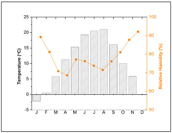 Average monthly temperature (bars) and relative humidity (orange line) (2010–2020).