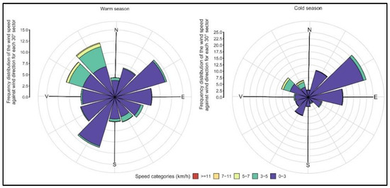 The wind direction in Cluj-Napoca is largely influenced by the local topography, being fairly consistent with the Someșul Mic Valley orientation (generally from southwest to northeast). In addition, the wind direction pattern can have significant variations throughout the seasons. During the cold season (October–March) when the regional influence of the East European anticyclone is increasing, the daytime winds tend to blow from the east-northeast (36.8% of all observations in the range of 45–105°), bringing continental polar air masses over Romania. In the warm season (April–September) the winds are more likely to come from the northwest (23.8% of all observations in the range of 285–345°), although the east-northeast directions have maintained their high prevalence. High percentages are also specific to winds that come from the southwest (Figure 3). The average daytime wind speed is low in the study area, being higher in the warm season (1.94 m/s) and lower in the cold season (1.86 m/s). Analyzing the wind speed (m/s) against wind direction, it can be observed that the highest average wind speeds are clearly related to the northwesterly directions that usually bring unstable polar maritime air masses (Figure 3). Due to the sheltering conditions induced by the Western Carpathians and the Somesul Mic Valley, the atmospheric calm has a high frequency (47.2%), with minimum values in the warm season and for daytime conditions, thus producing more frequent pollution episodes.