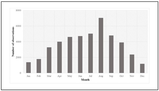 As one of the objectives of this study is to determine the climatology of aerosols in the Cluj-Napoca region, the analysis encompassed 44,070 observations collected between 2010 and 2020. Figure 4 illustrates the monthly distribution of the data points during the entire measuring period. It can be observed that the quantity of data obtained is correlated with the number of sunny days and daylight hours, since measurements rely on direct solar irradiance. This proportionality is apparent if we consider the simulated historical climate and weather data for Cluj-Napoca available on the meteoblue® website [62]. This data shows that July and August are the months with the most sunny and partly cloudy days (over twenty-four days per month). Thus, most observations were made in the summer months (mainly July and August), December being the month with the lowest number of observations (1169).