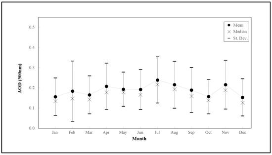 The monthly mean variation of AOD at 500 nm is presented in Figure 5. Retrievals at this wavelength show peak monthly AOD values in July–August (0.23 and 0.21 ± 0.11, respectively), while the minimum values are recorded in December and January (0.15 ± 0.09). In the absence of precipitation, the low scavenging of atmospheric aerosols is linked to the warm-season maximum. In addition, aerosols resulting from wildfires caused by severe drought events in Eastern Europe have influenced the aerosol load in the atmosphere in the summer months. On the other hand, higher precipitation values in the colder months played a dominant role in below-cloud aerosol wet deposition. In addition, the behavior of the population in Eastern Europe plays a role in contributing to the total aerosol load in the atmosphere in the cold season, through generating controlled fires (biomass burnings) in agricultural regions [63]. The majority of these fires occur during the pre-spring (February) and late autumn (November) periods.