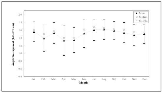 Figure 6 shows the monthly mean variation of the angstrom exponent (440–870 nm). Upon initial observation, it becomes apparent that fine particles prevail throughout the year, as indicated by AE values surpassing 1. The overall mean value of the AE for the entire measurement period is 1.5 ± 0.29, with a maximum of 1.62 ± 0.26 in August, and a minimum of 1.33 ± 0.39 in April. The April minimum can be mainly attributed to the presence of larger aerosol particles such as mineral dust. This is a consequence of the Saharan dust intrusion events, as shown in [39,63,64,65].