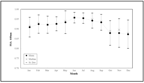 Monthly variability of Single Scattering Albedo (SSA) values at 440 nm with AERONET level 1.5.