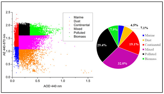 AOD at 440 nm against the angstrom exponent, classified according to Dubovik et al. [47] for the whole dataset (left). Pie chart of the classification for the whole dataset (right).