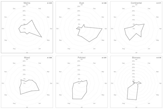 The graphics presented in Figure 9 depict the monthly distribution of observations for each aerosol class, to highlight the potential seasonal character of different types of aerosols. While mixed and polluted aerosols appear to be more prevalent in the summer months, their high correlation coefficient with the total number of observations (λr = 0.86 for mixed and λr = 0.91 for polluted) suggests that they are present throughout the year. It is possible that their apparent prevalence in the summer months is due to proportional representation.
