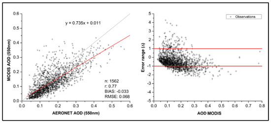 For the C6 MODIS MAIAC retrievals, the highest quality data were selected for validation. The MAIAC AOD uncertainty is estimated at ±(0.05 + 0.1⋅AOD) [21]; however, regional influences were reported, ranging from ±(0.05 + 0.15AOD) over South Asia [25] and China [61], to ±(0.05 + 0.05AOD) over South America [24]. We decided to evaluate the reported uncertainty estimate of ±(0.05 + 0.01⋅AOD) by [21]. To achieve a rigorous validation effort we opted for the method described in [59].