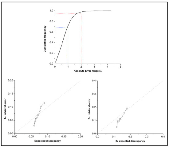 The cumulative distribution function (CDF) in Figure 11 suggests that the normalized errors are randomly distributed, with slight deviations from an ideal curve. The bottom row shows 12 equally divided bins of the expected discrepancy vs. the 1σ retrieval errors and twice the expected discrepancy vs. the 2σ retrieval errors, as suggested in [59]. The MAIAC uncertainties seem to be overestimated on the low end and slightly underestimated on the high end, with the majority of values being clustered close to the 1:1 line. When assessing the 2σ retrieval errors, the overestimation of uncertainties at Cluj-Napoca is slightly more apparent, although the bin values seem to cluster more together, suggesting that the retrieval errors are roughly Gaussian. Overall, these findings indicate that the uncertainties of the MAIAC AOD retrievals over Cluj-Napoca are fairly well estimated.