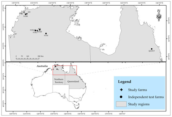 Location map showing the study farms and the independent test farms for model development and validation in the Northern Territory and Queensland, Australia.