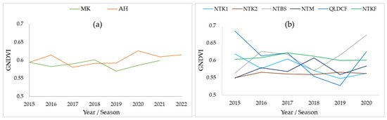 Following the image filtering step in GEE which filtered out all images with cloud cover >10%, the statistics of selected individual images were subsequently extracted to calculate different VIs (Table 3). Block and farm (in the case of the independent test farms) specific remote sensing data were extracted using Google Earth Engine (GEE) [52] and further analyzed with the R statistical software version 4.1.2 [53]. Therefore, four VIs derived from the surface reflectance values of the Landsat bands were used in this study (Table 3). Figure 4 shows the annual average GNDVI for the study farms (AH and MK) and the independent test farms over the time series.
