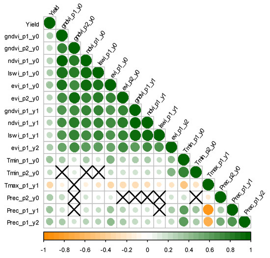 Correlation coefficients (different size circles) among yield and 16 best individual predictors selected based on the strength of the correlation at p < 0.05. Insignificant relationships are marked with an (×) and the color ramp shows the direction of the correlation.