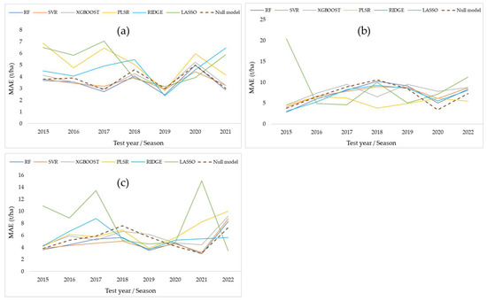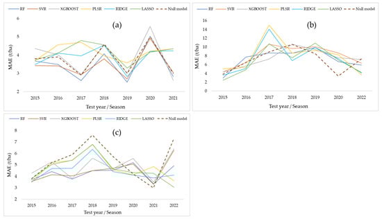 The models were trained using only RS variables, with data both from the MK farm and the AH farm, and the LOYO training/testing strategy was applied. Generally, the RF model using this strategy provided the best predictions (average MAE = 4.3 t/ha), and XGBOOST provided the worst predictions (average MAE = 4.9 t/ha). As shown in Figure 7, some years were predicted more accurately than others, with 2015 the best (average MAE = 3.7 t/ha) and 2018 the worst (average MAE = 5.8 t/ha). The remote sensing models provided lower errors on average than the null model, demonstrating the utility of the modeling approach.