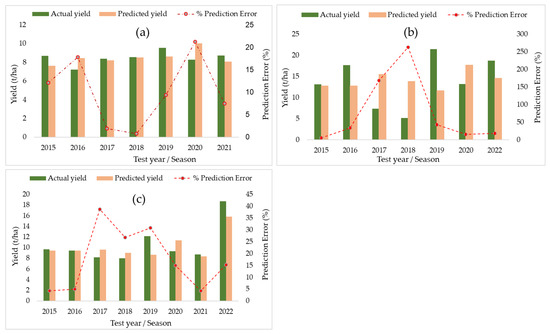 RS-based RF model predicted yield for: (a) MK farm; (b) AH farm; (c) combined farms model. The secondary y-axis shows the errors (%) associated with the predictions across the time series (2015–2022).
