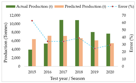 Similarly, block-level predictions (production in tons using Equation (1)) for each farm were summed and compared with the respective block-level yield data obtained from growers per year. This was converted to percentage error of the model (FLEM) by finding the absolute difference of the sum of block-level predictions (Pred) and the sum of the block-level actual yield (Act) divided by the sum of block-level actual yield expressed as a percentage (Equation (4)):