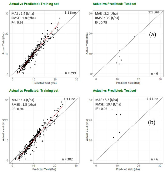 In the previous sections, we reported models trained using data from both farms. In the current section, we compare that method to models trained and tested on single farms. This could be due to the possibility of one farm contributing more to the model accuracy. To determine this, two different assessments were conducted as follows: (a) evaluating a model trained using both farms’ data (combined model) and testing on an individual farm and (b) evaluating a model trained and tested on the same farm. The assessments both used RF models based on the LOYO approach. The RF model trained with data (2016–2022) from the two farms (AH and MK) and tested on an independent year (2015) of an individual farm (AH) (Figure 10a), produced accuracies marginally better (MAE = 2.6 t/ha, R2 = 0.58) than the one trained and tested on an individual farm data over the same period (MAE = 2.9 t/ha, R2 = 0.47) (Figure 10b). The farm-level prediction error for both models (FLEM) was <10%.