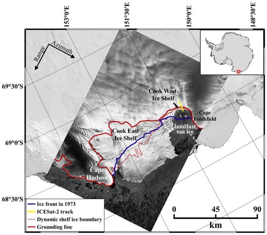 Sentinel-1 SAR image of the Cook Ice Shelf on 23 December 2022. The red and blue solid lines represent the grounding line [] and the ice front position in 1973 determined from the Landsat-1 images on 1 and 4 November 1973. The red dotted line represents the boundary between the dynamic shelf ice zone and the passive shelf ice zone. The yellow solid line indicates the ICESat-2 ground track used to analyze crevasse advance. The background is the Landsat Image Mosaic of Antarctica.
