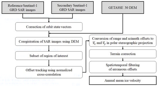 Flowchart of data processing for the generation of annual ice velocity.