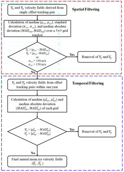 Erroneous offsets can result from offset tracking due to misregistration of image pairs when large changes occur on the ice surface or if there are few surface features []. To generate a reliable map of ice shelf velocity, the erroneous offsets should be determined and removed. Although offsets with a cross-correlation coefficient of less than 0.05 were removed through the previous process, it is likely that incorrect offsets remain. Focusing on the advantage of the Sentinel-1 observation that offset tracking of a 36-day temporal baseline is possible every 12 days, we proposed a spatiotemporal filtering method for the determination and removal of erroneous offsets (Figure 3).