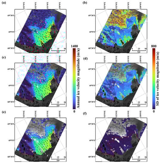 The differences in the 2017 annual ice velocity fields between the ITS_LIVE data and that from the Sentinel-1 time-series SAR offset tracking (Sentinel-1 time-series offset tracking velocity—ITS_LIVE velocity) are shown in Figure 5d–f. Our annual ice velocities showed smaller differences (~±15 m/a in most of the ice shelf regions) from the ITS_LIVE velocities than the MEaSUREs velocities. The difference in (Figure 5d) was slightly larger than that in (Figure 5e), but only ~±20 m/a in the ice shelf regions.