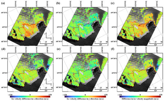 Differences between the 2017–2018 annual mean ice velocity of the MEaSUREs data and that from the Sentinel-1 time-series SAR offset tracking, and between the 2017 annual mean ice velocity of the ITS_LIVE data and that from the Sentinel-1 time-series SAR offset tracking for (a,d) the image x-direction, (b,e) the image y-direction, and (c,f) flow direction, respectively.