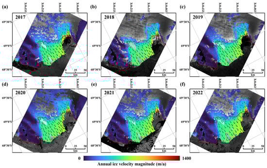 The annual ice velocity maps of the Cook Ice Shelf in (a) 2017, (b) 2018, (c) 2019, (d) 2020, (e) 2021, and (f) 2022 determined from the Sentienl-1 time-series SAR offset tracking. The black arrows represent the ice flow directions.