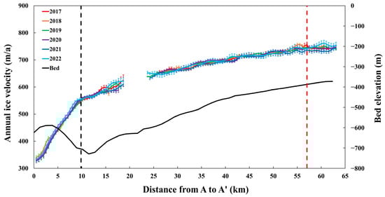 Annual ice velocities of CEIS from 2017 to 2022 and bed elevation (black solid line) along the profile marked as A–A′ in Figure 4e. The vertical black and red dotted lines represent the location of the grounding line and the boundary between the dynamic shelf ice zone and the passive shelf ice zone.