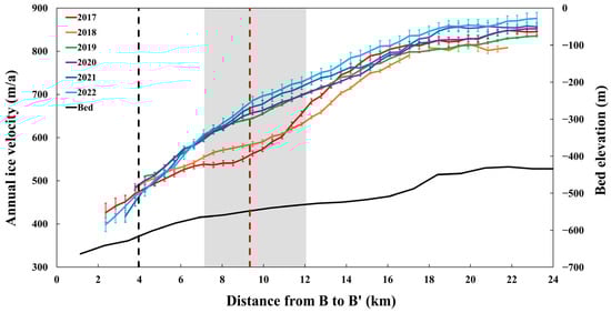 Annual ice velocities of western CEIS from 2017 to 2022 and bed elevation (black solid line) along the profile marked as B–B′ in Figure 4e. The vertical black and red dotted lines indicate the location of the grounding line and the boundary between the dynamic shelf ice zone and the passive shelf ice zone, respectively.
