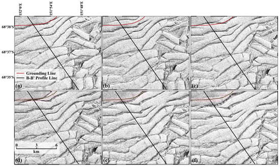 Sentinel-1 time-series SAR images of the western CEIS. The red and black lines indicate the grounding line and the profile B–B′, respectively. (a) 4 June 2017, (b) 5 June 2018, (c) 18 July 2019, (d) 12 June 2020, (e) 7 June 2021, (f) 2 June 2022.