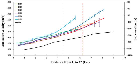 Annual ice velocities of CWIS from 2017 to 2022 and bed elevation (black solid line) along the profile marked as C–C′ in Figure 4e. The vertical black and red dotted lines, respectively, indicate the location of the grounding line and the boundary between the dynamic shelf ice zone and the passive shelf ice zone.