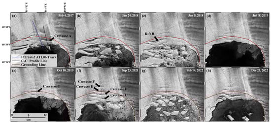 Figure 11 shows time-series Senitnel-1 SAR images of the CWIS from 2017 to 2022, from which we can confirm the changes in the ice front position as a result of various calving events. Crevasse A observed in February 2017 at 5.7 km on the profile C–C′ was completely developed in January 2018, leading to the collapse of the ice front (Figure 11a–c). Figure 11c,d shows that the ice front collapsed between June 2018 and July 2019 as a result of the development of rift B and other fractures, but the exact timing of the collapse could not be determined for lack of images. Successive ice front collapse can reduce the volume of the ice shelf, which weakens its buttressing potential and could contribute to flow acceleration of the grounded ice [,]. From 2019 to 2021, the ice front continued to advance (Figure 11d–f), and the annual ice velocity of the grounded ice decreased and stayed constant through 2021 (Figure 10). However, several fractures, including crevasses and rifts, caused successive collapses of the ice front in February 2022 (Figure 11g), resulting in a retreat of the ice front by about 2.5 km. It is noteworthy that part of the dynamic shelf ice zone, which plays a critical role in buttressing, was lost as a result of the collapse in February 2022 (Figure 10 and Figure 11g). This could be a result of the faster acceleration of ice velocity between 2021 and 2022 rather than the acceleration between 2017 and 2021. Since March 2022, the ice front has continued to advance (Figure 11h); however, multiple fractures have been observed on the ice shelf surface, which indicates the potential for further collapse.