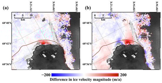 Difference in the annual ice velocity magnitude of the Cook West Ice Shelf (a) between 2020 and 2021 (2021 ice velocity–2020 ice velocity) and (b) between 2021 and 2022 (2022 ice velocity–2021 ice velocity).