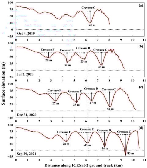 Crevasses on the CWIS were observed from the ICESat-2 ATL06 products and their development characteristics were studied. When crevasses form perpendicular to the ground track of an altimeter, they can be detected as “V” features in the altimeter-observed elevation profile [,]. The crevasses on the CWIS were longitudinal crevasses that formed perpendicular to the flow direction of the ice shelf. The ground track of the ICESat-2 observations investigated in this study is nearly parallel to the flow direction of the CWIS. This made it possible to detect crevasses on the ice shelf from the “V” feature of the ICESat-2 ATL06 elevation profiles. In the elevation profiles, we defined the section where the elevation shows a “V” shape as the width of the crevasse, and the lowest elevation within the section as the depth of the crevasse []. Variations in the width and depth of the crevasse were analyzed from the elevation profiles from 2019 to 2021. The reliability of the crevasse detection from the ICESat-2 ATL06 data was evaluated using the location of crevasses observed in Sentinel-1 SAR images acquired within a few days of the altimeter observations. Figure 13 shows the ice surface elevation measured along the ICESat-2 ground track, as indicated in the blue line in Figure 11a. The crevasse that appears as a “V” feature between 6 and 6.5 km of the elevation profile on 4 October 2019 (Figure 13a) corresponds to crevasse C indicated in Figure 10e. Figure 11b–d shows that crevasse C advanced with increasing depth over time, and new crevasses (crevasses D, E, and F in Figure 11e) formed at the grounded region and continued to develop. Notably, the crevasses deepened substantially after 2020, which could contribute to the large acceleration of ice velocity between 2020 and 2021 (Figure 12). The depth of the crevasses would be deeper than analyzed in Figure 13 because the ICESat-2 ground track was not parallel to the advance direction of crevasses and may not have passed over the deepest point of the crevasses.