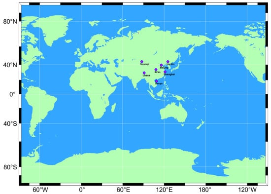 We simulated seven ground-monitoring stations, located in Harbin, Beijing, Xi’an, Urumqi, Lhasa, Shanghai, and Sanya, as shown in Figure 1.