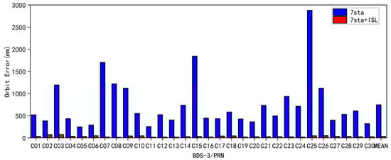 Figure 3 shows the effective values of seven sta and seven sta and ISL in the 3D RMS, using both schemes for POD and time synchronization experiments. It can be seen that the average orbit accuracy of all BDS-3 satellites is 0.748 m without ISL data. The seven sta and ISL scheme has an average orbital accuracy of 0.035 m. The use of ISL data resulted in a high orbit accuracy for BDS-3, with an improvement of about 96.1% compared to the seven sta schemes. The addition of ISL data can make up for the lack of the number and distribution of ground-monitoring stations, improve the tracking of geometric observation shape changes, and make the satellite geometry more robust [40].