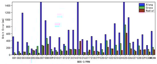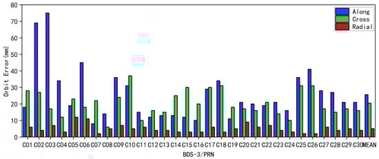 A satellite orbit assessment uses the difference between the calculated navigation satellite orbit and the real orbit to count the RMS value of the orbit difference in the along-track, cross-track, radial (A, C, R), and three-dimensional (3D) directions of the BDS-3 satellites’ orbit [10].