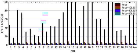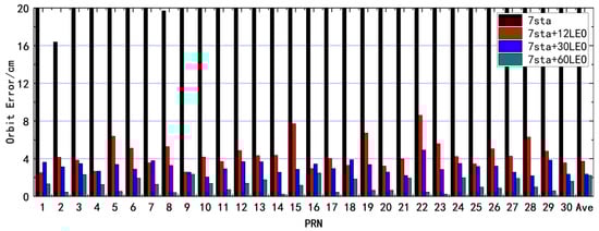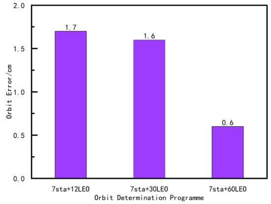 We used four different schemes, of 7 sta, 7 sta and 12 LEO, 7 sta and 30 LEO, and 7 sta and 60 LEO, for the distribution of the number of LEO satellites for the POD, and counted the average 3D accuracies. The average 3D accuracies of the four schemes were 95.1 cm, 3.1 cm, 2.4 cm, and 2.0 cm, respectively, as shown in Figure 9 and Figure 10.