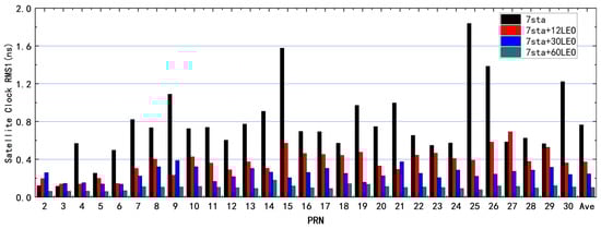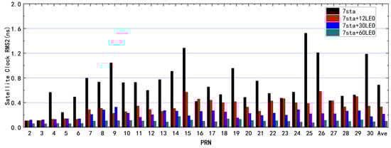 Four different LEO satellite distribution schemes of 7 sta, 7 sta and 12 LEO, 7 sta and 30 LEO, and 7 sta and 60 LEO were used to carry out time synchronization experiments, and as shown in Figure 11, resulting in the average values of RMS1 statistical accuracy of clock offset being 0.72 ns, 0.37 ns, 0.25 ns, and 0.10 ns, respectively. As shown in Figure 12 the average values of RMS2 statistical accuracy of clock offset are 0.68 ns, 0.33 ns, 0.21 ns, and 0.07 ns, respectively. The results show that LEO satellites can improve the accuracy of the BDS-3 satellite’s clock offset solution. Compared to the results of clock offset using only ground stations, the addition of 12 LEO satellites resulted in an improvement of 49% for RMS1 and 52% for RMS2, the addition of 30 LEO satellites resulted in an improvement of 66% for RMS1 and 70% for RMS2, and the addition of 60 LEO satellites resulted in an improvement of 87% for RMS1 and 90% for RMS2.