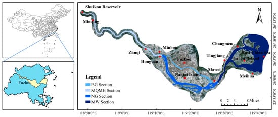 To obtain a more detailed understanding of the changes in the Minjiang River, the study area is divided into four distinct sections, as displayed in Figure 1. These sections include the following: MQMH section, NG sections, BG sections, and MW.