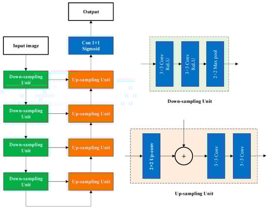 The water body identification in Landsat remote sensing images uses the UNet neural network. UNet is a highly symmetric encoder–decoder network widely used in image recognition fields such as biomedical, unmanned, and feature classification []. The model encoder layer comprises two convolutional layers of 3 × 3 size to extract features, and a 2 × 2 size maximum pooling module is employed to down-sample the extracted features. Each module in the decoder layer incorporates an up-sampling operation, which first employs a depth-space transformation through a 2 × 2 sized deconvolution module, and constructs a residual convolution layer connection at the same level to enable fusion of features across different scales. Finally, the decoded code is mapped to the water body identification result via a fully connected layer. Schematic diagram of UNet network structure as shown in Figure 3.