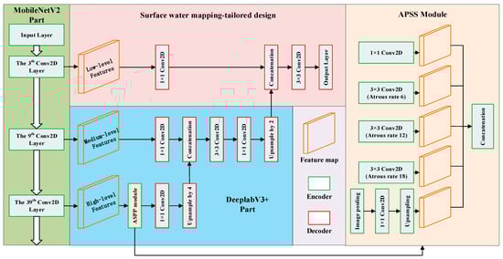 The identification of water bodies in Sentinel 2 remote sensing images utilizes a combined MobileNetV2 backbone network and DeeplabV3+ network proposed by Luo et al. [] (MobileNetV2 is a lightweight and efficient convolutional neural network that achieves high accuracy with fewer parameters, making it suitable for real-time processing of remote sensing images). On the other hand, DeeplabV3+ is a powerful semantic segmentation model that accurately classifies and segments objects in images, thanks to its encoder–decoder architecture with deconvolution and skip connections that capture multi-scale contextual information and enhances spatial resolution. Combining these two networks results in a high-accuracy model with low computational costs. The MobileNetV2 backbone network efficiently extracts features, while the DeeplabV3+ network leverages the feature maps for accurate semantic segmentation. This combination is particularly useful for real-time processing of large remote sensing datasets, specifically for water body identification. The specific structure of the proposed model is shown in Figure 4.