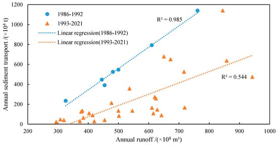 Figure 6 presents the annual variations in runoff and sediment transport at the Zhuqi hydrological station from 1986 to 2021. Over this timeframe, the annual runoff displays a fluctuating pattern, with the highest value in 2016 and the lowest in 1991, without a significant overall trend. There are some fluctuations in the annual sediment transport from 1986 to 1992, which decreases significantly after 1993. Moreover, the relationship between flow and sediment during the periods of 1986–1992 and 1993–2021 is shown in Figure 7. A strong linear relationship is observed between annual runoff and sediment transport from 1986 to 1992, with a linear regression R2 value of 0.985. However, after 1993, this relationship decreases, with an R2 value of 0.544. Additionally, the annual sediment transport shows a more obvious decreasing trend under the same annual runoff conditions.